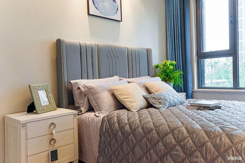 次卧高床屏由金属镶嵌,呈现简约有序的线条,雾霾蓝床屏与浅蓝朦胧装饰画,窗帘相呼应,色泽搭配和谐自然,无不透漏着一种简洁大方视觉体验。